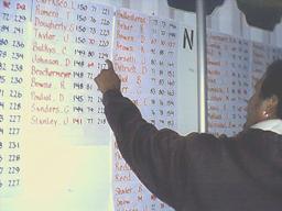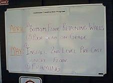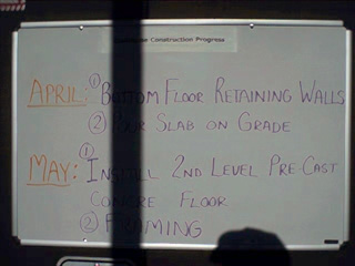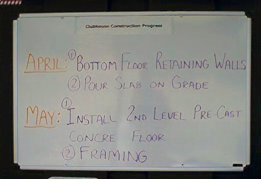 Sunday, April 13th, 2008: It would seem that I have an analog counterpart for my construction blog. Check out the white board now outside the starter office. I didn't inquire, but I would surmise people always ask about the progress of the the construction, so this helps dispel the questioning to the pros and starters.