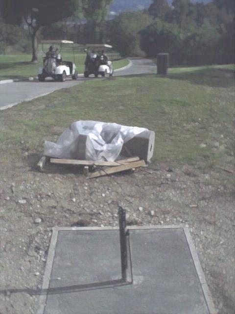Memorial Day, Monday, May 26th, 2008: It would seem that others are viewing this blog. I was paying at the starter today when Joaquin asked me if I was the one with the web site. I confessed to being the author. I guess Joaquin was looking for photos of the construction for some reason. I imagine they were sorely disappointed since I'm taking the photos with such a low resolution camera. I forgot to ask how they found the site. Anyway, Joaquin sounded like he had fun seeing this web page. Yesterday, I neglected to mention the new drinking fountain at the 5th tee. It's lovely, since it has a kid's basin as well. An identical fountain is being installed at the 13th tee. (See photo.) |