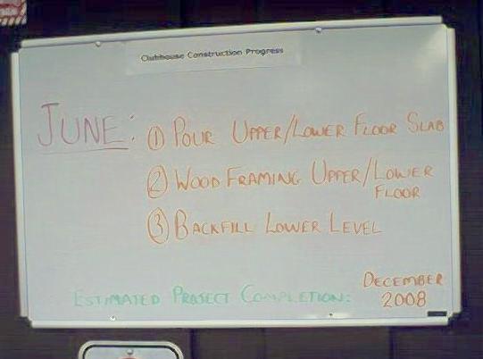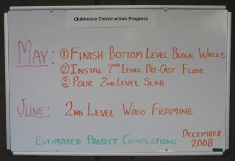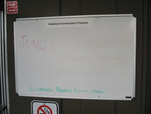 Sunday, August 10th, 2008: We've been away for a week so the picture tells the story of steady progress. We were at Campsite 19 hanging out with Lou talking about the contruction when Craig asked about the expected completion date. It was then that we noticed that the scorecard now says "Coming July 2006" again. Meanwhile the white board remains blank. Perhaps knowing that it'll be posted on the Internet inhibits its updating.